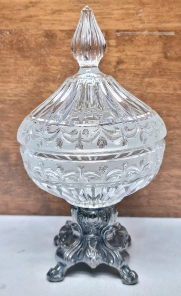 • ALEMANHA - Charmosa compoteira, feita em cristal de ótima qualidade e manufatura, adornada por rica variação de lapidações, apoiada sobre base rosqueada de metal trabalho de excelente fundição. Bom estado de conservação. Mede 21 cm de altura x 11 cm de diâmetro da borda. Alemanha, meados do Século XX.