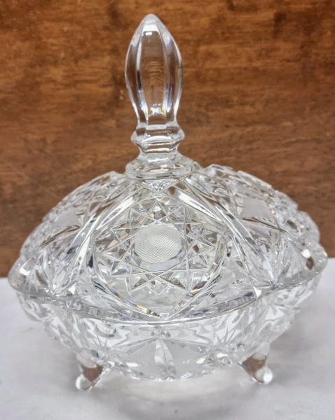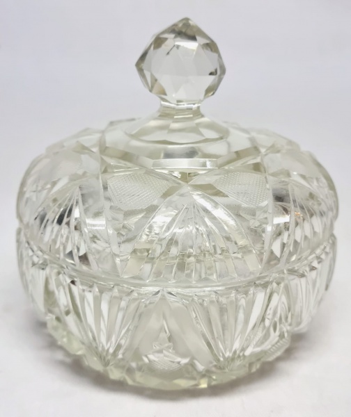 • REPÚBLICA TCHECA - Rara e belíssima caixa porta joias, feita em cristal da Bohemia de excelente qualidade e manufatura, em formato circular adornada por riquíssima variação de lapidações em tonalidade translúcida. Perfeito estado de conservação, mede 7 cm de altura x 12,5 cm de diâmetro. Rep. Tcheca meados do Século XX.