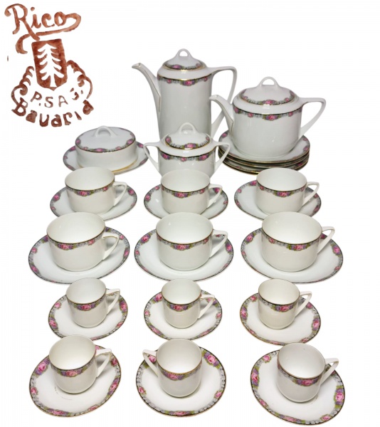 • PORZELLANFABRIK SCHONWALD AKTIENGESELLSCHAFT - BAVARIA, ALEMANHA INÍCIO SÉC.XX - ´´COLEÇÃO RICO´´ - Raríssimo e lindo aparelho de chá e café, peças executadas em porcelana de excelente qualidade e manufatura, adornadas por belíssima ornamentação floral e rios filetes á ouro. Composto por 6 xícaras para chá e 6 para café com seus respectivos pires, 1 bule, 1 chaleira, 1 manteigueira, 1 açucareiro e 4 pratos rasos para sobremesa. Bom estado de conservação. Xícaras para chá medem 6,5 cm de altura x 14,5 cm de diâmetro da borda, bule mede 20,5 cm de altura x 20,5 cm de comprimento x 8,5 m de  iâmetro da borda. Pratos medem 17,5 cm de diâmetro. Alemanha, início do Século XX.