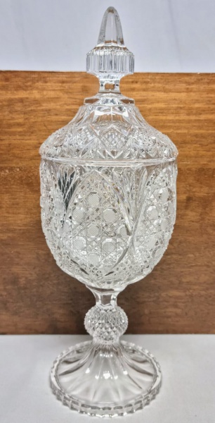 • Grande e elegante potiche, executado finamente em cristal de ótima qualidade, adornado por rica variação de lapidações em tonalidade translúcida. Perfeito estado de conservação, mede 35 cm de altura x 12 cm de diâmetro da borda.
