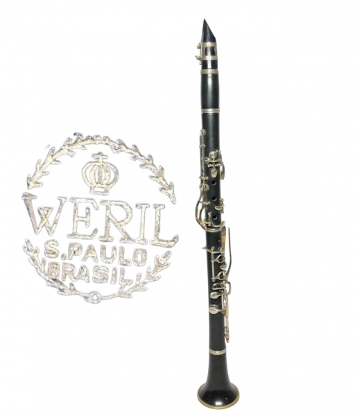 • WERIL - Clarinete com boquilha W5, excelente qualidade e manufatura. Possui gravação de renomada empresa Weril. Estrutura em bom estado de conservação com leves marcas de uso. Não possui teste de funcionamento/afinamento.