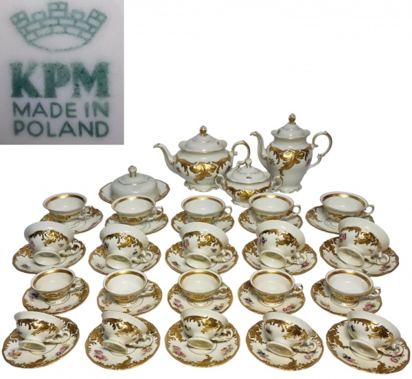 • Krister Porzellan-Manufaktur - KPM - POLÔNIA - Majestoso aparelho de chá e café, peças elegantemente executadas em porcelana de excepcional qualidade e renomada manufatura. Adornadas por belíssima ornamentação floral e riquíssimos filetes e coberturas á ouro em relevo. Composto por 10 xícaras para chá e 10 para café com seus respectivos pires, 1 bule, 1 chaleira, 1 açucareiro e 1 manteigueira. Xícaras para chá medem 6,5 cm de altura x 15 cm de diâmetro dos pires. Em perfeito estado de conservação. Polônia meados do Século XX. Oportunidade!