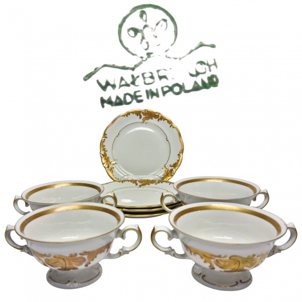• WALBRZYCH - POLÔNIA - Raríssimo e lindo jogo de 4 xícaras Consommé com 4 pratos rasos. Peças executadas em porcelana de excepcional qualidade e renomada manufatura. Adornadas por riquíssimo trabalho em relevo com coberturas á ouro. Perfeito estado de conservação. Pratos medem 17,5 cm de diâmetro e xícaras 6 cm de altura x 11 cm de diâmetro da borda cada. Polônia meados do Século XX. Oportunidade.