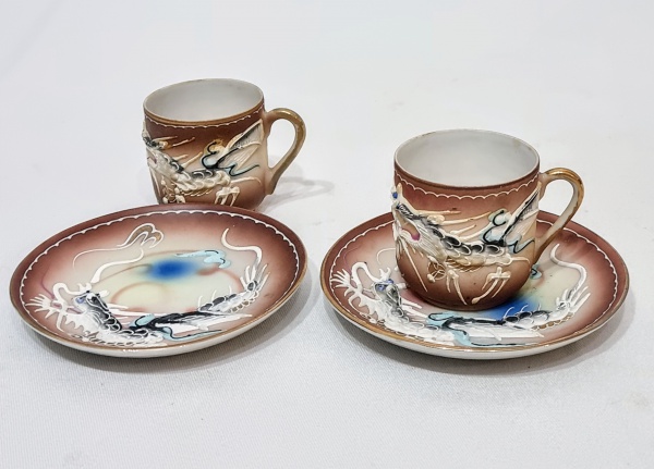 • JAPÃO - Lindíssimo e clássico par de xícaras para café de coleção, executadas finamente em porcelana de ótima qualidade e manufatura, adornadas por clássico e rico motivo de dragões em relevo. Perfeito estado de conservação. Medem 4,5 cm de altura x 9,0 cm de diâmetro do pires cada.