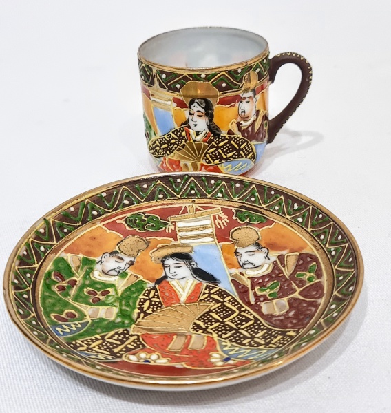 • Antiga e rara xícara de coleção executada finamente em antiga faiança oriental, adornada por riquíssimo trabalho em tonalidades vibrantes. Perfeito estado de conservação, mede 4,5 cm de altura x 9,5 cm de diâmetro do pires.