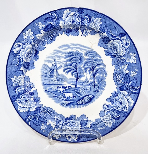 • WOOD & SONS, INGLATERRA - Belíssimo e antigo prato raso de coleção, executado em antiga faiança de excelente qualidade e manufatura, adornado por riquíssimo motivo floral e antiga paisagem ao centro. Mede 23,0 cm de diâmetro. Bom estado de conservação, possui discretos fios de cabelo por conta do tempo. Inglaterra, Século XX.