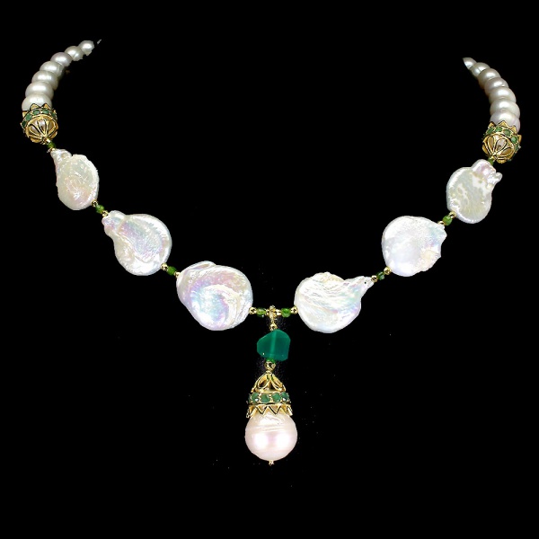 • Majestoso colar de Pérolas Barroca e Biwa, design exclusivo de excepcional ourivesaria, fino acabamento com botões de Esmeralda e belíssimo pingente em prata espessurada a ouro amarelo adornado por rico trabalho no formato de Coroa com rica cravação de Esmeraldas de lapidação brilhante e linda Pérola barroca de 18 x 12 mm. Perfeito estado de conservação , sem uso. Mede aprox 51 cm , pingente 4,0 x 1,4 cm. Origem África e Tailândia .