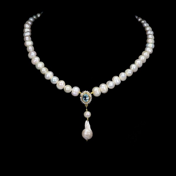 • Majestoso colar de Pérolas, design exclusivo de excepcional ourivesaria com belíssimo pingente em prata espessurada a ouro amarelo adornado por rico trabalho e belo Topázio Sky blue de 8.0 x 6.0 mm, clássica lapidação oval brilhante, adornado por preciosa coroa de Zirconias extra brancas, arrematado por fino acabamento com linda Pérola Barroca de 18 x 8.0 mm . Perfeito estado de conservação , sem uso. Mede 46 cm , pingente 4,8 x 1,2 cm . Origem África e Tailândia.