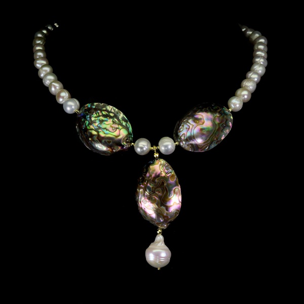 • Majestoso colar de Pérolas barroca, design moderno exclusivo de excepcional ourivesaria, fino acabamento com belíssimos medalhões de 3,5 x 2,5 cm em Abalone, arrematados por elegante pingente com linda Pérola barroca de 18 x 12 mm. Perfeito estado de conservação , sem uso. Mede aprox 46 cm , pingente 6,5 x 2,5 cm. Origem Austrália e Tailândia .