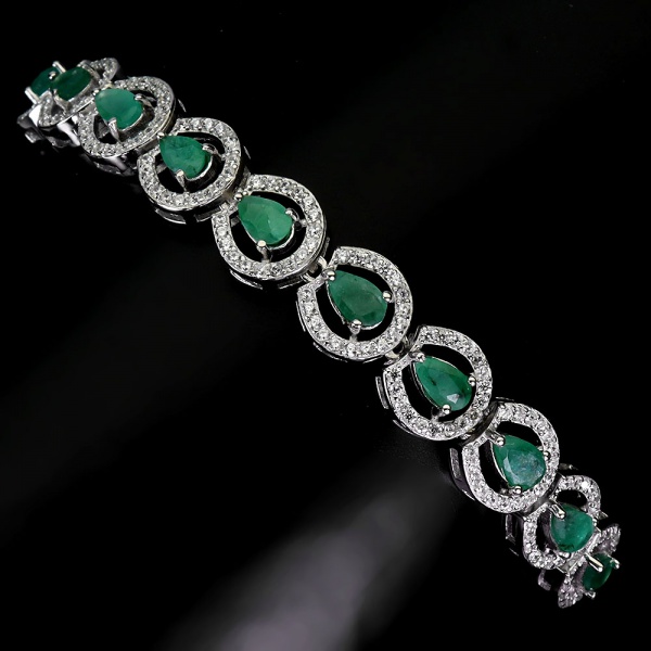 • Majestosa pulseira em prata de lei espessurada a ouro branco, design moderno exclusivo de excepcional ourivesaria com preciosa cravação de Esmeraldas de 5.0 x 3.0 mm, clássica lapidação pera brilhante, adornadas por rico trabalho, belíssimas coroas de Zirconias extra brancas e fino acabamento. Perfeito estado de conservação, sem uso . Mede aprox 20 cm de comprimento x 0,8 cm. Origem Colômbia.
