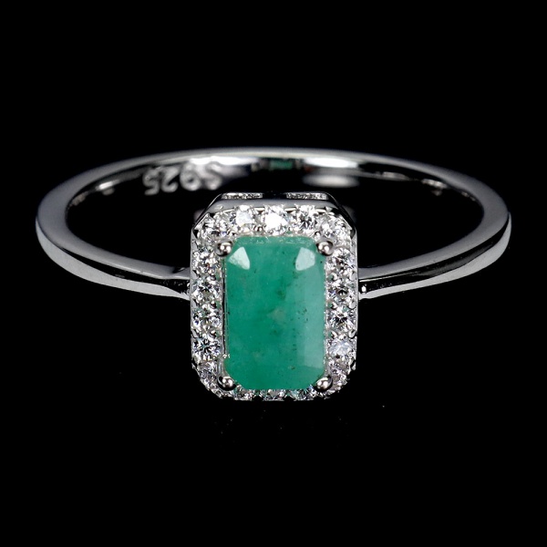 • Belíssimo Anel em prata de lei espessurada a ouro branco, design moderno exclusivo com preciosa Esmeralda de 6.0 x 4.0 mm, clássica lapidação octogonal brilhante, adornada por rico trabalho, fino acabamento e majestosa coroa de Zirconias extra brancos com fino acabamento. Perfeito estado de conservação, sem uso. Aro mede 1,8 cm, armação 0,6 x 0,8 cm. Origem Zâmbia. Possui inclusões naturais.