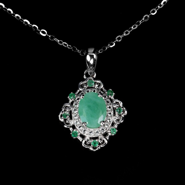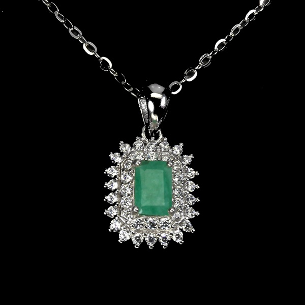 • Belíssimo colar em prata de lei espessurada a ouro branco, design exclusivo de excepcional ourivesaria. Pingente com preciosa Esmeralda extra de 6.0 x 4.0 mm, clássica lapidação octogonal brilhante, adornada por rico trabalho e fino acabamento com majestosas coroas de Zirconias extra brancas. Perfeito estado de conservação, sem uso. Corrente com clássica malha elo português, mede 45 cm, pingente 1,8 x 1,0 cm. Origem Zâmbia. OBS: FORMA CONJUNTO COM OS LOTES Nº 158, 159 E 160.