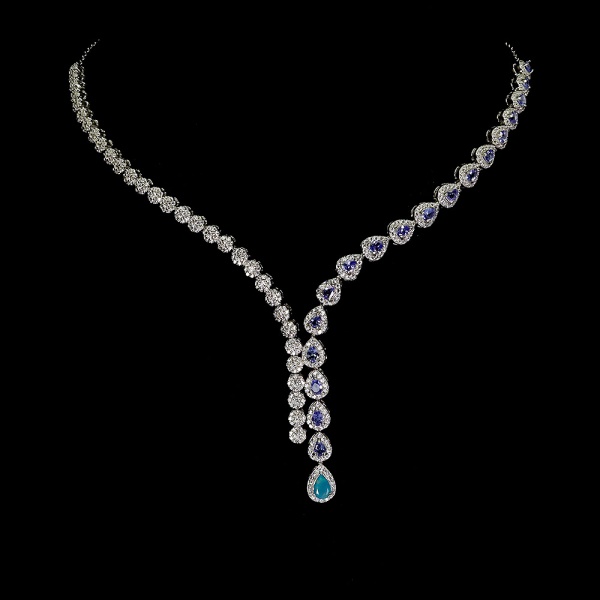 • Majestoso colar em prata de lei espessurada a ouro branco, design moderno exclusivo de excepcional ourivesaria com preciosa cravação de Tanzanitas extra de 4.0 x 3.0 mm, clássica lapidação pera brilhante, adornadas por rico trabalho e belíssimas guirlandas e coroas de Zirconias extra brancas com fino acabamento, arrematadas por elegante pingente de Opala azul de 6.0 x 4.0 mm lapidação pera brilhante. Perfeito estado de conservação, sem uso. Mede aprox 48 cm de comprimento, pingente aprox 6,0 x 1,0 cm. Origem Tanzânia, Etiópia e África.