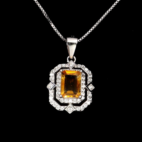 • Majestoso colar em prata de lei espessurada a ouro branco, design exclusivo de excepcional ourivesaria. Pingente com precioso Citrino extra de 7.0 x 5.0 mm, clássica lapidação esmeralda brilhante, adornado por rico trabalho, fino acabamento e majestosa coroa de Topázios extra brancos de lapidação brilhante. Perfeito estado de conservação, sem uso. Corrente com clássica malha veneziana, mede 45 cm, pingente 2,0 x 1,0 cm. Origem África e Brasil.