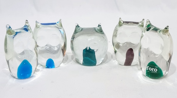 • CÁ DORO - Lindíssimo lote composto por 5 esculturas/pesos executados finamente em vidro artístico de murano de excelente qualidade, representando belas e expressivas corujas, tonalidades translúcidas coloridas, design moderno e exclusivo. Perfeito estado de conservação, maior mede 8,0 cm.