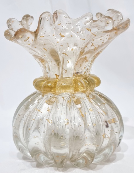 • MURANO - Belíssimo vaso em vidro artístico de Murano de tonalidade translúcida, design exclusivo, feitio gomado com bolhas, pó de ouro, moriza, lindíssima borda e riquíssimo trabalho. Perfeito estado de conservação. Mede 16 cm de altura x 12,5 x 12,5 cm da borda. aproximadamente