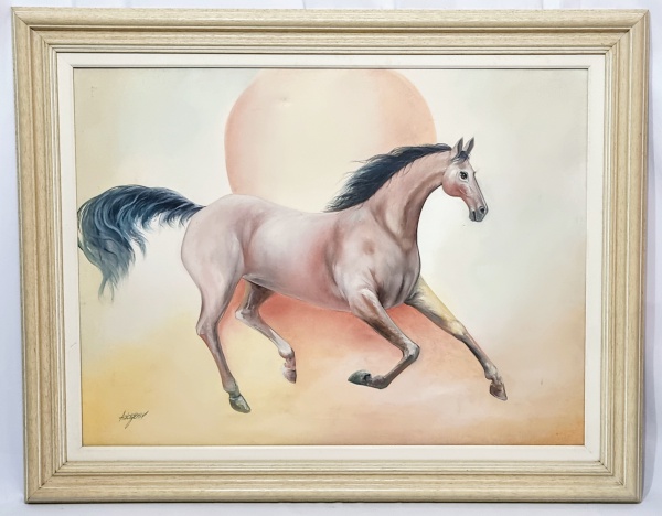 • ADAGENIR - 60 x 80 - Linda pintura finamente executada em técnica de óleo sobre tela, representando expressivo cavalo rico em movimentos e colorações. Assinada no C.I.E. Enquadrada em moldura de madeira patinada medindo 77 x 97 cm. Perfeito estado de conservação.