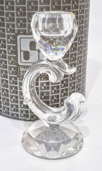 • SWAROVISKI - Impecável e elegante castiçal em cristal translucido, decorado com rica lapidação e extraordinária luminescência. Selado sobre a base Swarovski. Áustria, meados de 1980. Perfeito estado de conservação. Mede aprox 12 cm de altura x 6,0 cm de diâmetro da base..