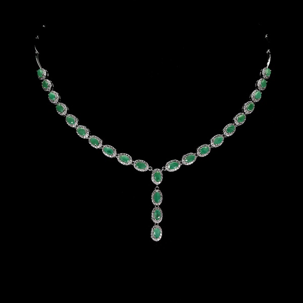 • Majestoso colar em prata de lei espessurada a ouro branco, design moderno exclusivo de excepcional ourivesaria com preciosa cravação de Esmeraldas extra de 5.0 x 3.0 mm, clássica lapidação oval brilhante, adornadas por rico trabalho, belíssimas coroas de Zirconias extra brancas e fino acabamento. Perfeito estado de conservação, sem uso. Mede aprox 50 cm de comprimento, pingente 3,5 x 0,6 cm. Origem Colômbia, Tanzânia e África. OBS: FORMA CONJUNTO COM O LOTE Nº 482 E 483.
