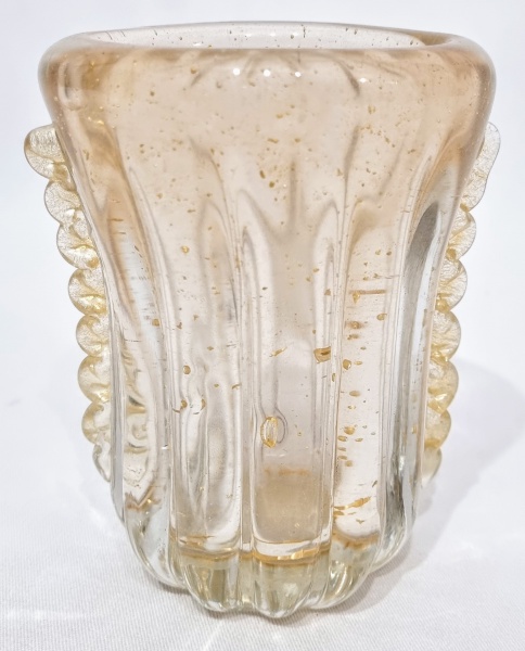 • MURANO - Belíssimo e elegante vaso em vidro artístico de Murano, design exclusivo com linda tonalidade, rico feitio gomado com bolhas, pó de ouro e adornado por linda e rara Moriza. Perfeito estado de conservação. Mede 12,5 cm de altura x 9,5 cm de comprimento x 08 cm de largura.
