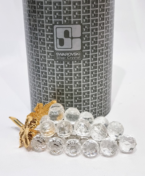 • SWAROVISKI - Impecável e linda escultura em cristal translúcido retratando raro e lindo cacho de uvas, decorado com 22 esferas, estrutura em metal dourado de ótima fundição, rica lapidação e extraordinária luminescência. Selado sobre a base Swarovski. Acondicionado em estojo original. Áustria, meados de 1980. Perfeito estado de conservação. Mede aprox 4,5 cm de altura x 16,0 cm de comprimento x 6,5 cm de largura.