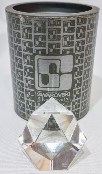 • SWAROVISKI - Impecável escultura em cristal translucido retratando raro peso de papel no formato geométrico, decorado com rica lapidação e extraordinária luminescência. Selado sobre a base Swarovski. Áustria, meados de 1980. Perfeito estado de conservação. Mede aprox 4,5 x 5,0 cm.