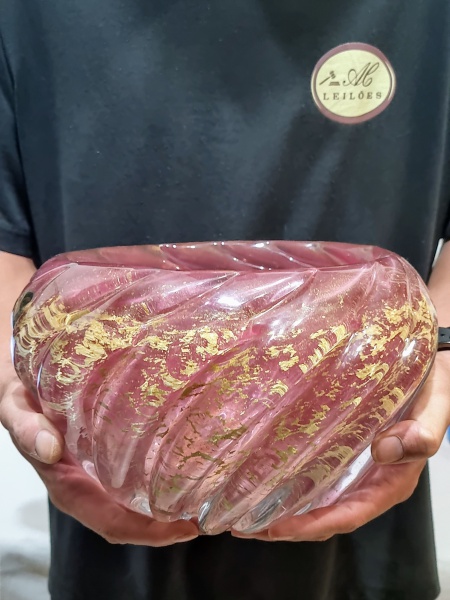 • Majestoso e belíssimo bowl centro de mesa, executado finamente em pesado vidro artístico de Murano com bela tonalidade, adornado por riquíssimo pó de ouro espalhado, design moderno e exclusivo com trabalho torceil. Perfeito estado de conservação. Mede 16,5 cm de altura x 20 cm de diâmetro da borda.