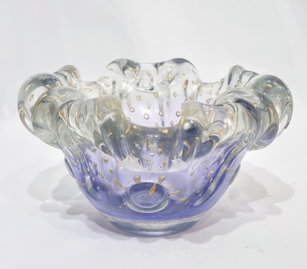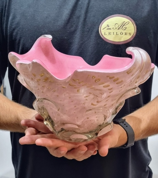 • Elegante e belíssimo centro de mesa executado finamente em vidro artístico de murano de excepcional qualidade, adornado por rico trabalho em relevo com bolhas e pó de ouro, elegante borda tiotada em linda tonalidade. Mede 10,5 cm de altura x 18 cm de diâmetro aproximadamente. Impecável estado de conservação.