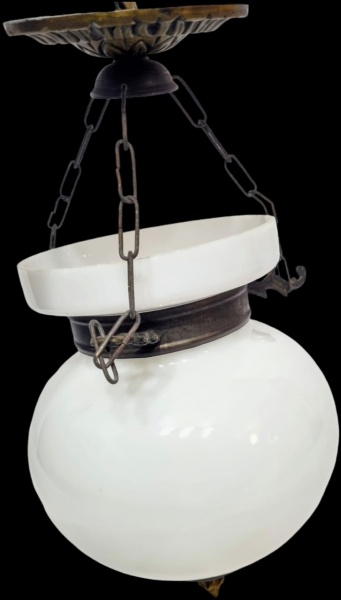 • Clássico lustre executado finamente em metal de ótima fundição, bucal único com cúpula de rico trabalho tiotado. Bom estado de conservação. Brasil início do Século XX. Mede aproximadamente 47 cm de altura x 20 cm de largura, necessita fiação nova.