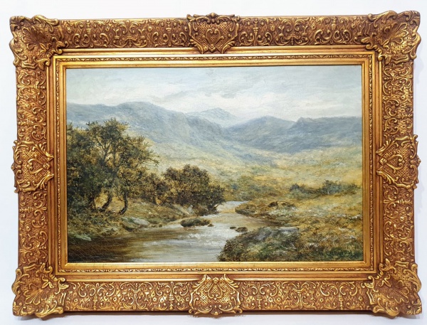 • WALTER LANGLEY (BIRMINGHAM, REINO UNIDO, 1852 - 1922 PENZANCE, REINO UNIDO) - Preciosa e belíssima pintura finamente trabalhada em técnica á óleo sobre tela, representando linda paisagem. Assinada no C.I.D. medindo 41 x 61 cm. Enquadrada em majestosa moldura de época em madeira nobre ricamente trabalhada medindo 60 x 80 cm. Bom estado de conservação. NOTA SOBRE O ARTISTA: Ele nasceu em Birmingham , onde seu pai era alfaiate. A partir dos 15 anos, tornou-se aprendiz de litógrafo . Aos 21, ele conseguiu uma bolsa de estudos para South Kensington, onde estudou design por dois anos. Seu trabalho, às vezes muito ornamentado em ouro e prata, é no estilo renascentista . Ele voltou para Birmingham, onde se dedicou inteiramente à pintura. Em 1881 ele foi recebido como associado da Royal Birmingham Society of Artists  (em) . Naquele mesmo ano, um fotógrafo de Birmingham, o Sr. Thrupp, ofereceu-lhe  500  por um ano de seu trabalho. Com esse dinheiro, Langley mudou-se com sua família para Newlyn , no sudoeste da Cornualha, onde foi um dos primeiros artistas a se estabelecer.Politicamente de esquerda para sua época, ele se destacou pelo (in) realismo social  de seus retratos das classes trabalhadoras, em particular dos pescadores e suas famílias. Ele apoiou o socialista radical Charles Bradlaugh (1833-1891). Muitas de suas pinturas refletem sua simpatia pelos pescadores com quem viveu. Mais é conhecido Por Homens Devem Trabalhar e Mulheres Devem Chorar 1883 ( Museu e Galeria de Arte de Birmingham ), baseado no poema de Charles Kingsley Three Fishers (em) (1851). Outro é Between The Tides (1901, Warrington Museum & Art Gallery (en) ).   Embora um dos primeiros a se estabelecer na colônia de artistas da Newlyn School , Langley inicialmente se beneficiou pouco com sua crescente notoriedade, em parte por causa de suas origens populares e em parte porque antes de 1892 ele pintava principalmente em aquarelas em vez das mais prestigiosas tintas a óleo . A sua formação inicial em litografia confere às suas pinturas um pormenor e uma textura que revelam o seu domínio técnico.Sua reputação cresceu mais tarde em sua carreira. Uma de suas pinturas foi descrita por Leo Tolstoy como uma "bela e verdadeira obra de arte" em seu livro O que é arte? (1898). Em 1895, Langley foi convidado pela Galeria Uffizi para fornecer um autorretrato para exibir ao lado dos de Raphael , Rubens e Rembrandt em sua coleção de retratos de grandes artistas. Hoje, seu trabalho é considerado "essencial para a imagem da escola de Newlyn" e "com a de Stanhope Forbes (...) o mais consistente no estilo e o mais importante na quantidade. "Ele morreu em Penzance emMarço de 1922.