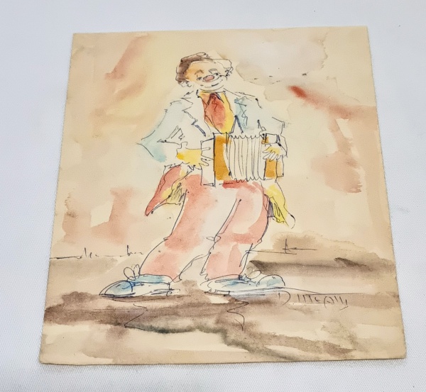 • DARIO MECATTI (Florença,ITA, 1909 - 1976, SP) - ´´ESTUDO´´ - Raríssimo e delicado desenho executado finamente em técnica mista sobre papel, representando expressivo palhaço rico em movimentos e colorações. Assinado no C.I.D. Esboço atrás do mesmo. Bom estado de conservação, possui discretos furinhos. NOTA SOBRE O ARTISTA: Dario Mecatti (Florença, Itália 1909 - São Paulo SP 1976). Pintor de gênero, paisagista e desenhista. Na Itália recebe orientação artística de Camillo Innocenti (1871-1961), trabalha em um banco e pinta cartazes para a sala de cinema de seu primo. Em 1933, muda-se para a África, onde permanece por aproximadamente sete anos viajando pelo norte do continente. Neste período conhece a Líbia, Ilha de Malta, Tunísia, Turquia, Argélia, Marrocos, além de Portugal e Espanha. Durante a viagem retrata cenas destes países e realiza algumas exposições com o pintor florentino Renzo Gori (1911-?), com quem reside por pouco tempo em Paris. Em 1939, conhece a Ilha de São Miguel, nos Açores e lá encontra Maria da Paz com quem posteriormente se casa. No ano de 1940, muda-se para o Brasil, passa pouco tempo no Rio de Janeiro e posteriormente, um período em Minas Gerais, onde visita as cidades de Belo Horizonte, Juiz de Fora e Ouro Preto. Muda-se no final do ano para São Paulo, onde entre 1941 e 1945, trabalha na Galeria Fiorentina, na Rua Barão de Itapetininga, de propriedade de Malho Benedetti. Em 1945 se casa com a pintora Maria da Paz e conhece Nicolino Bianco, que passa a adquirir os quadros do artista para serem expostos na Loja de Móveis Paschoal Bianco. Apresenta-o para clientes e amigos que passam a encomendar retratos. Neste período entra em contato com Ezio Barbini, dono da Galeria Internacional que vende regularmente suas obras, além de apresenta-lo a um grupo de jovens artistas a quem orienta. Em 1946 constrói na Rua Feliciano Maia a sua casa estúdio, onde realiza exposições individuais anuais, sendo a última no ano de 1976, data de seu falecimento. ( fonte: Itaú Cultural)