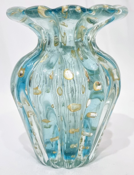 • MURANO - Belíssimo vaso em vidro artístico de Murano, linda tonalidade e feitio com bolhas, pó de ouro e linda borda. Perfeito estado de conservação. 14,5 cm de altura x 11 cm de diâmetro da borda. Itália século XX .