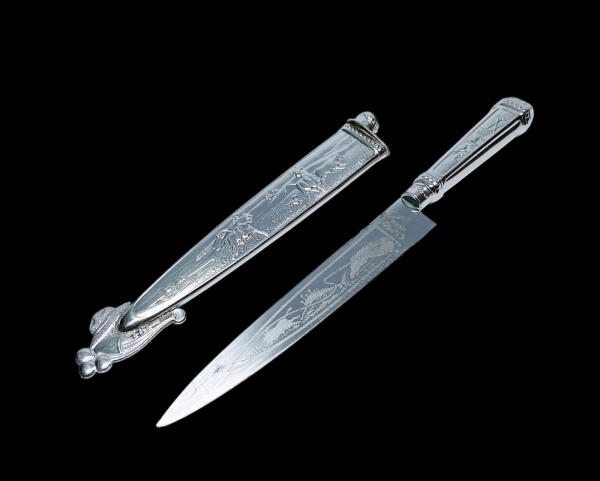 • Clássica e antiga faca gaúcha com lâmina de aço inoxidável de excelente manufatura Elmo, cabo e bainha em metal prateado de ótima fundição com riquíssimo trabalho em relevo. Mede 29 cm de comprimento. Brasil meados do Século XX. Excelente estado de conservação.