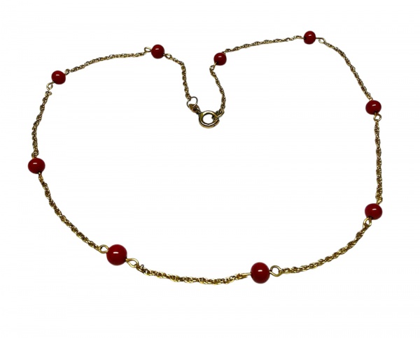 • Elegante corrente em ouro 18 k teor 750, malha exclusiva com feitio de excepcional ourivesaria, adornada por rico trabalho e fino acabamento com bolinhas de coral natural. Itália séc XX. Excelente estado de conservação. peso 3.5 gramas . mede 38 cm de comprimento.