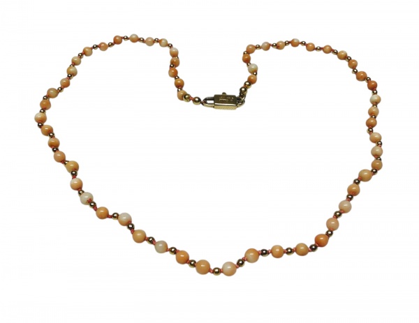 • Elegante colar de coral natural adornadas por rico trabalho com bolinhas de ouro 18 k e fino acabamento com belo fecho em ouro 18 k teor 750, contraste Chmento. Itália séc XX. Excelente estado de conservação. peso 7.3 gramas . mede 44 cm de comprimento.