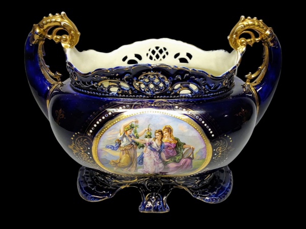 • ROYAL VIENNA - Magnifica floreira palaciana em rara porcelana finamente decorada com linda cena representando as três Graças. Borda com rico trabalho fenestrado, fundo com requintado acabamento em azul cobalto com riquíssimos filetes, pintura e cobertura a ouro. Marca da preciosa manufatura Royal Vienna sobre a base. Tchecoslováquia final do séc XIX. Excelente estado de conservação. Mede aprox 23 x 31 x 16 cm.