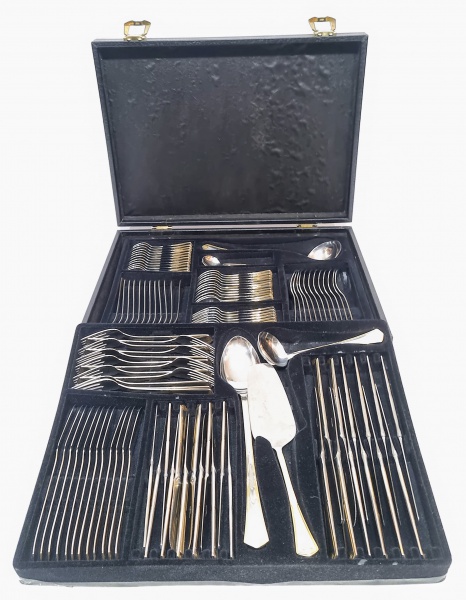 • MORIBER 18/8 - ESPANHA - Charmoso e raríssimo faqueiro, peças executadas em aço nobre inoxidável (18% cromo - 8% níquel) de ótima qualidade e fundição, adornadas por rico trabalho floral. Design modernista e exclusivo. Composto por 12 garfos para jantar, 12 para peixe e 12 para sobremesa; 12 facas para jantar, 12 para peixe e 12 para sobremesa; 12 colheres para sopa, 12 para sobremesa, 12 para chá e 12 para café; 03 talheres de serviço. Ambos em perfeito estado de conservação. Acondicionados em estojo/maleta original medindo 18,0 x 50,0 x 28,5 cm. Oportunidade.