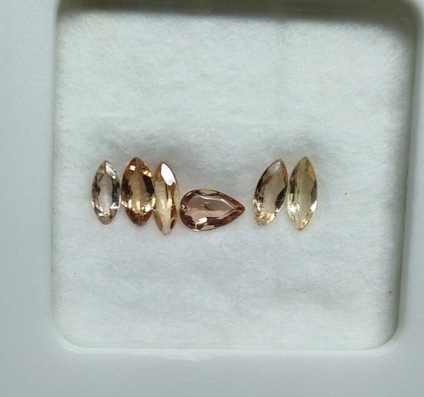 • Lindo Lote composto por 06 Preciosos e raros Topázios Imperial Extra pêssego e mel, totalizando 2.125 cts, Excelente qualidade AAA e clareza transparente , clássicas lapidações gota e navete brilhante, medindo aprox 7.0 x 4.0 mm, 6.0 x 3.0 mm, 7.0 x 3.0 e 5.0 x 3.0 mm. Ótimo investimento para montar uma joia de qualidade . Origem Brasil . Acondicionadas em caixa acrílica .