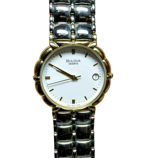 • RELÓGIO BULOVA SWISS - ELEGANTE MODELO VINTAGE - BELA CAIXA DE 32 MM EM AÇO DOURADO COM FINO ACABAMENTO, PULSEIRA NOVA DE 17 MM EM AÇO. FUNÇÕES: HORAS, MINUTOS, SEGUNDOS E CALENDÁRIO. RESISTENTE À ÁGUA. MOVIMENTO QUARTZ SWISS DE PRECISÃO FUNCIONANDO EM EXCELENTE ESTADO DE CONSERVAÇÃO, ACONDICIONADO EM ESTOJO ORIGINAL.