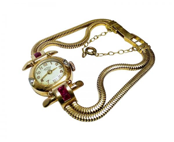 • RARO RELÓGIO RENNA SWISS, FEITIO EM OURO 18 K DE EXCEPCIONAL OURIVESARIA COM RICO TRABALHO E FINO ACABAMENTO COM RUBELITAS E BRILHANTES. MAQUINÁRIO 17 JÓIAS COM MECANISMO A CORDA FUNCIONANDO EM EXCELENTE ESTADO DE CONSERVAÇÃO. CAIXA MEDE APROX 22 X 18 MM , PULSEIRA 6.0 MM . PESO TOTAL 20.4 GRAMAS.