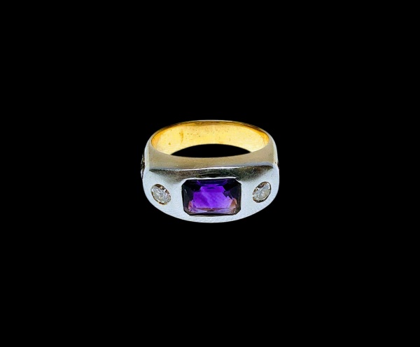 • CLÁSSICO E BELÍSSIMO ANEL DE FORMATURA, FEITIO DE EXCEPCIONAL OURIVESARIA EM OURO 18 K TEOR 750 ADORNADO POR RICO TRABALHO EM PLATINA, FINO ACABAMENTO COM 2 DIAMANTES E PRECIOSA AMETISTA DE 8.0 X 6.0 MM DE LAPIDAÇÃO ESMERALDA BRILHANTE. EXCELENTE ESTADO DE CONSERVAÇÃO. ARO MEDE 1,8 CM. ARMAÇÃO 1,8 X 0,8 CM. PESO TOTAL 9.7 GRAMAS.