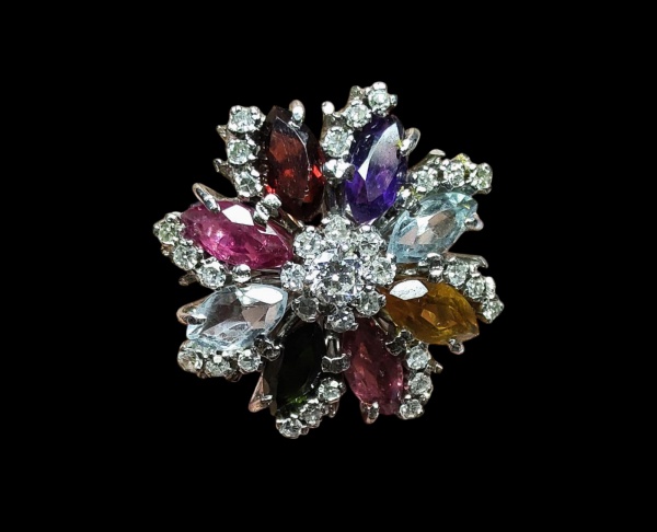 • MAJESTOSO ANEL DE OURO BRANCO 18 K TEOR 750, DESIGN MODERNO FLORAL EXCLUSIVO COM PRECIOSA CRAVAÇÃO DE TURMALINAS MULTI COLORIDAS E FINO ACABAMENTO COM RICA INCRUSTAÇÃO DE DIAMANTES EXTRA BRANCOS COM LINDO BRILHO, TOTALIZANDO APROX 1.00 CT. EXCELENTE ESTADO DE CONSERVAÇÃO. ARO MEDE 1,7 CM. ARMAÇÃO 2,0 CM. PESO 5.7 GRAMAS.