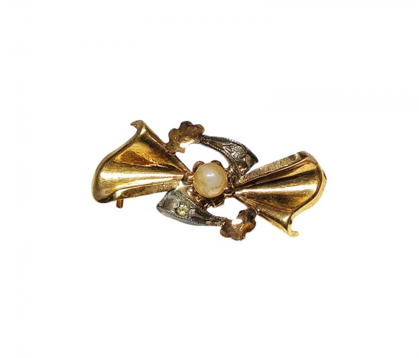 • ELEGANTE BROCHE DE OURO 18 K TEOR 750, DESIGN VINTAGE COM RICO TRABALHO E ACABAMENTO COM PLATINA E BRILHANTES. EXCELENTE ESTADO DE CONSERVAÇÃO. MEDE APROX 3,0 X 1,2 CM. PESO 2.1 G.