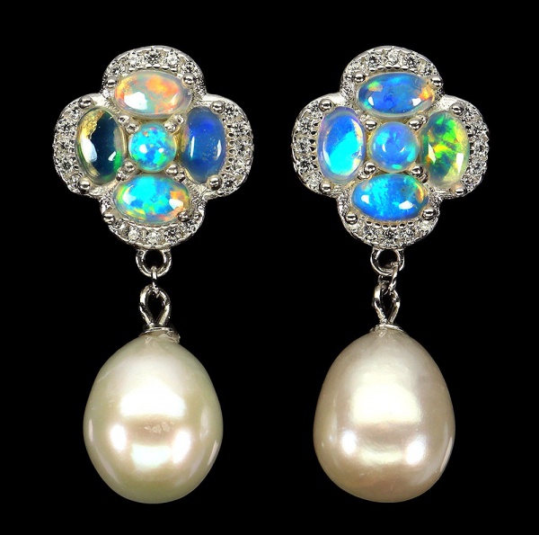 • Charmoso par de brincos em prata espessurada a ouro branco, design exclusivo de excepcional ourivesaria com preciosa cravação de Opalas de fogo de 5.0 x 3.0 mm, clássica lapidação oval brilhante, adornadas por rico trabalho com Zirconias de lapidação brilhante, e fino acabamento com linda Pérola de 8.0 mm. Perfeito estado de conservação, sem uso. Medem 2,8 x 1,2 cm . origem Etiópia e Tailândia.