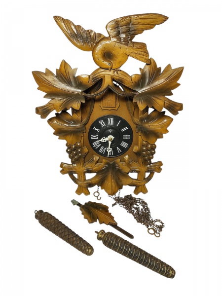 • Clássico Relógio Cuco manufatura H, caixa finamente executada em madeira nobre, decorada com rico entalhe e fino acabamento contendo pássaro e parreiras. Manufatura H é a mais valiosa para o colecionismo de Relógios Cuco. Brasil inicio do século XX . Excelente estado de conservação, funcionando com bela melodia. Acompanha pesos e pêndulo. Mede aprox 44 x 34 x 16 cm .