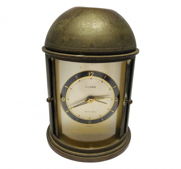 • FLORN GERMANY - RARO RELÓGIO DESPERTADOR MONTADO EM ELEGANTE CAIXA DE METAL COM PORTA QUE ABRE E FECHA. MANUFATURA FLORN, ALEMANHA INICIO DO SÉC XX. MAQUINÁRIO COM MECANISMO A CORDA NO ESTADO. MEDE APROX 11 X 8,0 CM.