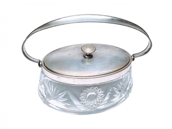 • W.M.F - RARA BISCOITEIRA DE ESTILO E ÉPOCA ART'DECO EM CRISTAL LAPIDADO, ADORNADO POR TAMPA E AÇA EM METAL ESPESSURADO A PRATA DE EXCELENTE FUNDIÇÃO.CONTRASTE DA PRECIOSA MANUFATURA W.M.F NO METAL. ALEMANHA INICIO DO SÉCULO XX. ÓTIMO ESTADO DE CONSERVAÇÃO, MEDE APROX 12 X 20 X 14 CM, CONSIDERANDO A ALÇA 18 X 23 X 14 CM.