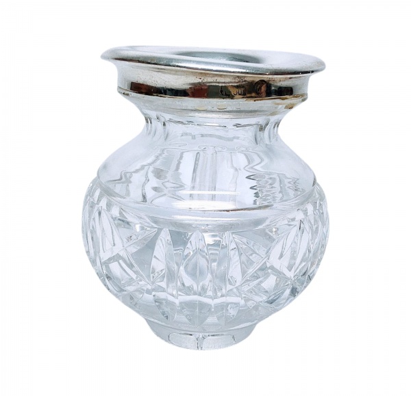 • DELICADO VASO EM CRISTAL RICAMENTE LAPIDADO, ADORNADO POR PRECIOSA BORDA EM PRATA DE LEI TEOR 800 CONTRASTADO. ALEMANHA INICIO DO SÉC XX. CRISTAL EM PERFEITO ESTADO, BORDA DE PRATA COM DISCRETAS MOSSAS. MEDE APROX 8,0 X 6,0 CM.