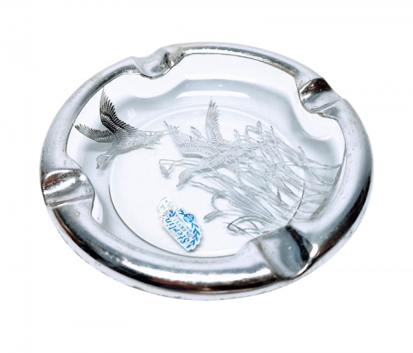 • SILVER CITY GLASS CO - ELEGANTE E RARO CINZEIRO EM VIDRO DE EXCELENTE MANUFATURA, FINAMENTE DECORADO COM PRECIOSA PINTURA EM PRATA CONTENDO AVES, ORNAMENTAÇÃO E RICA COBERTURA NA BORDA. USA MEADOS O SÉC XX. ÓTIMO ESTADO DE CONSERVAÇÃO. MEDE APROX 3,5 X 15 CM.