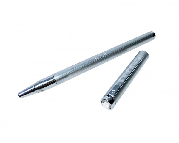 • SWAROVSKI - BELA CANETA EM METAL PRATEADO DE ÓTIMA QUALIDADE, DECORADA COM BELO CRISTAL NA TAMPA E FINO ACABAMENTO. PRECIOSA MANUFATURA SWAROVSKI, AÚSTRIA SÉC XX. EXCELENTE ESTADO DE CONSERVAÇÃO. MEDE APROX 12,5 CM.